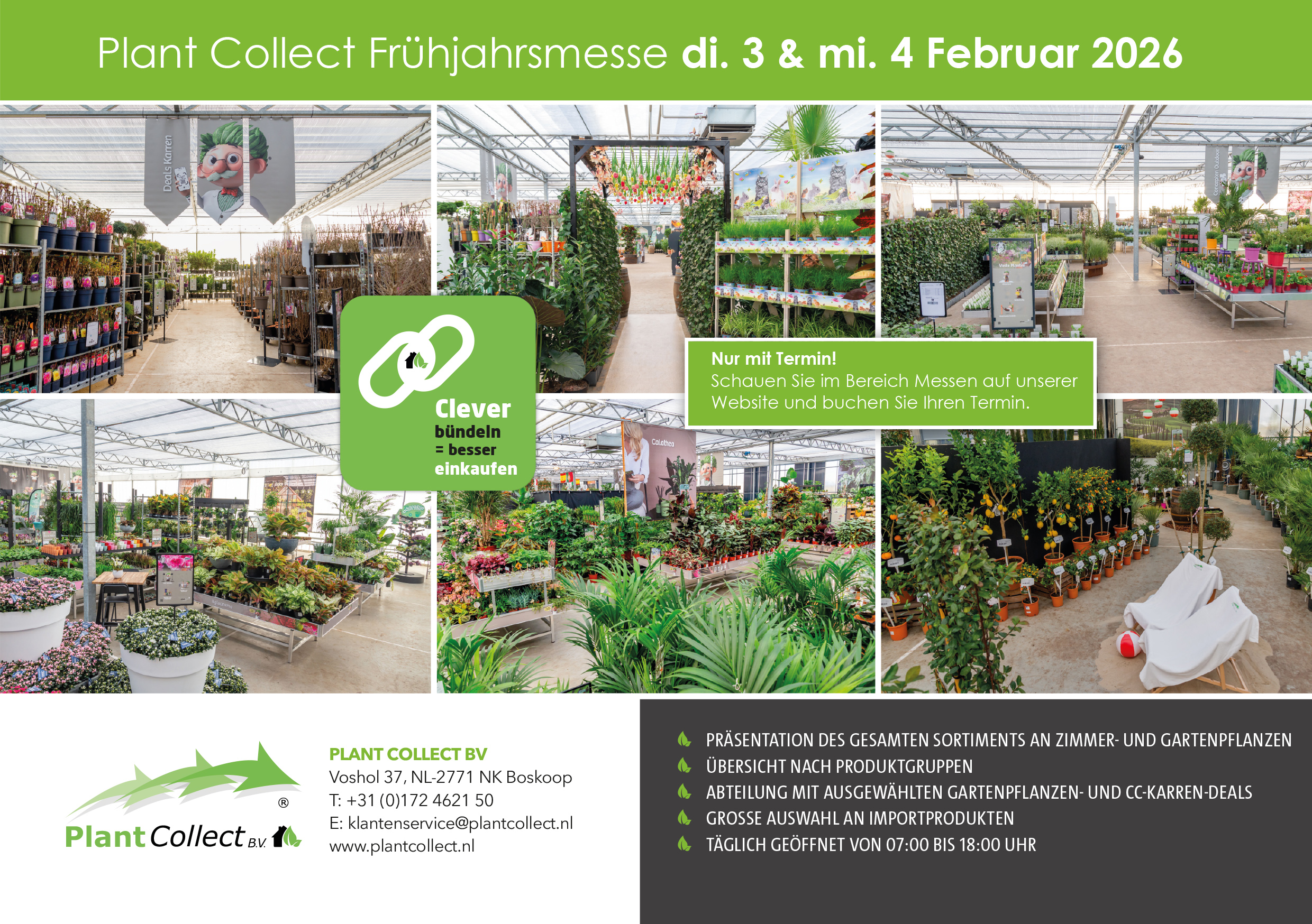 Zweimal im Jahr, im Frühjahr und Herbst, veranstalten wir die Plant Collect Messe. Während dieser Messe präsentieren wir unser vollständiges Sortiment an Garten- und Zimmerpflanzen, übersichtlich nach Produktgruppen sortiert. Außerdem stellen wir sowohl bestehende als auch neue Konzepte für Zimmer- und Gartenpflanzen vor. Auf der Frühjahrsmesse am 3. und 4. Februar 2026 präsentieren wir unser Modell der „Vol CC Deals/Direkt frisch vom Züchter“ in neuem Gewand: ab sofort unter dem Namen „Clever bündeln = besser einkaufen"