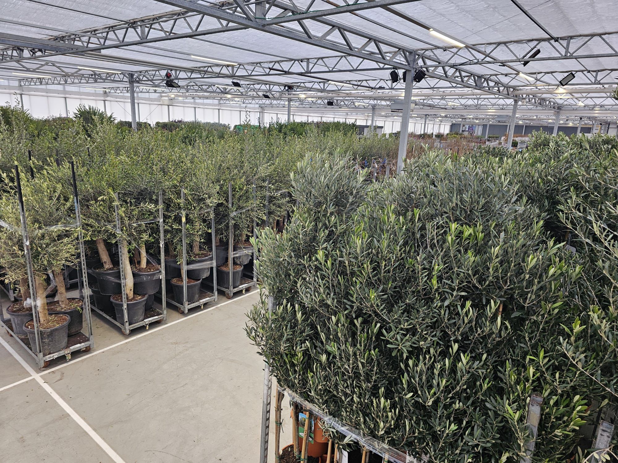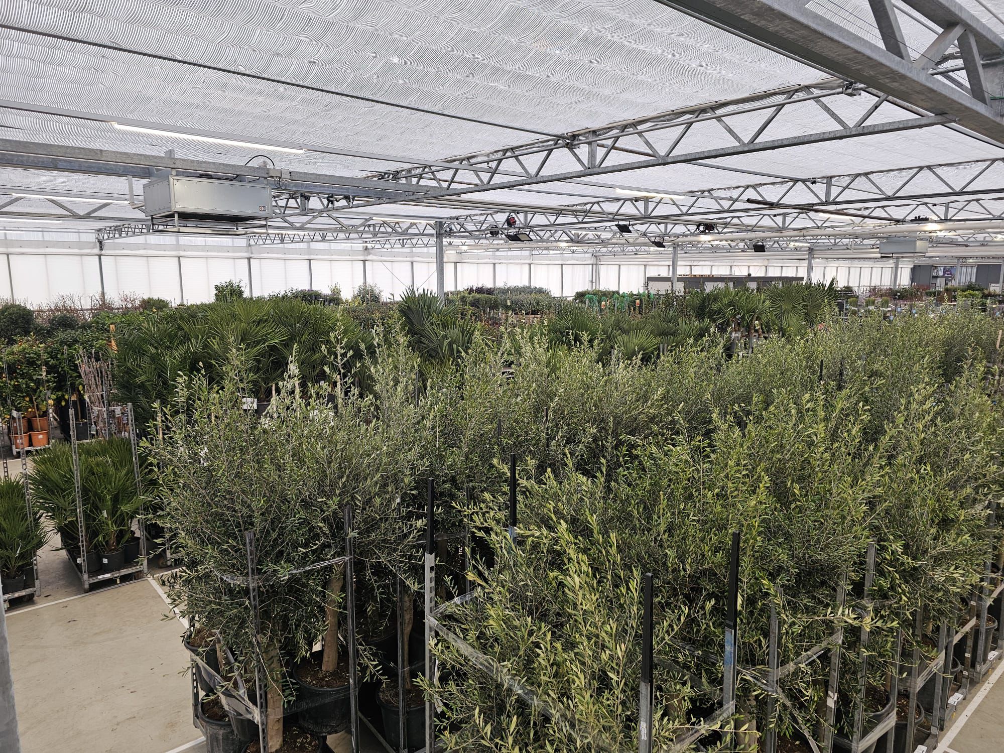 Among them were Nerium, Trachycarpus, and olive trees in various pot sizes.