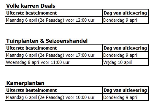 In week 15 hanteren wij een aangepast bestel- en uitleverschema in verband met Pasen.