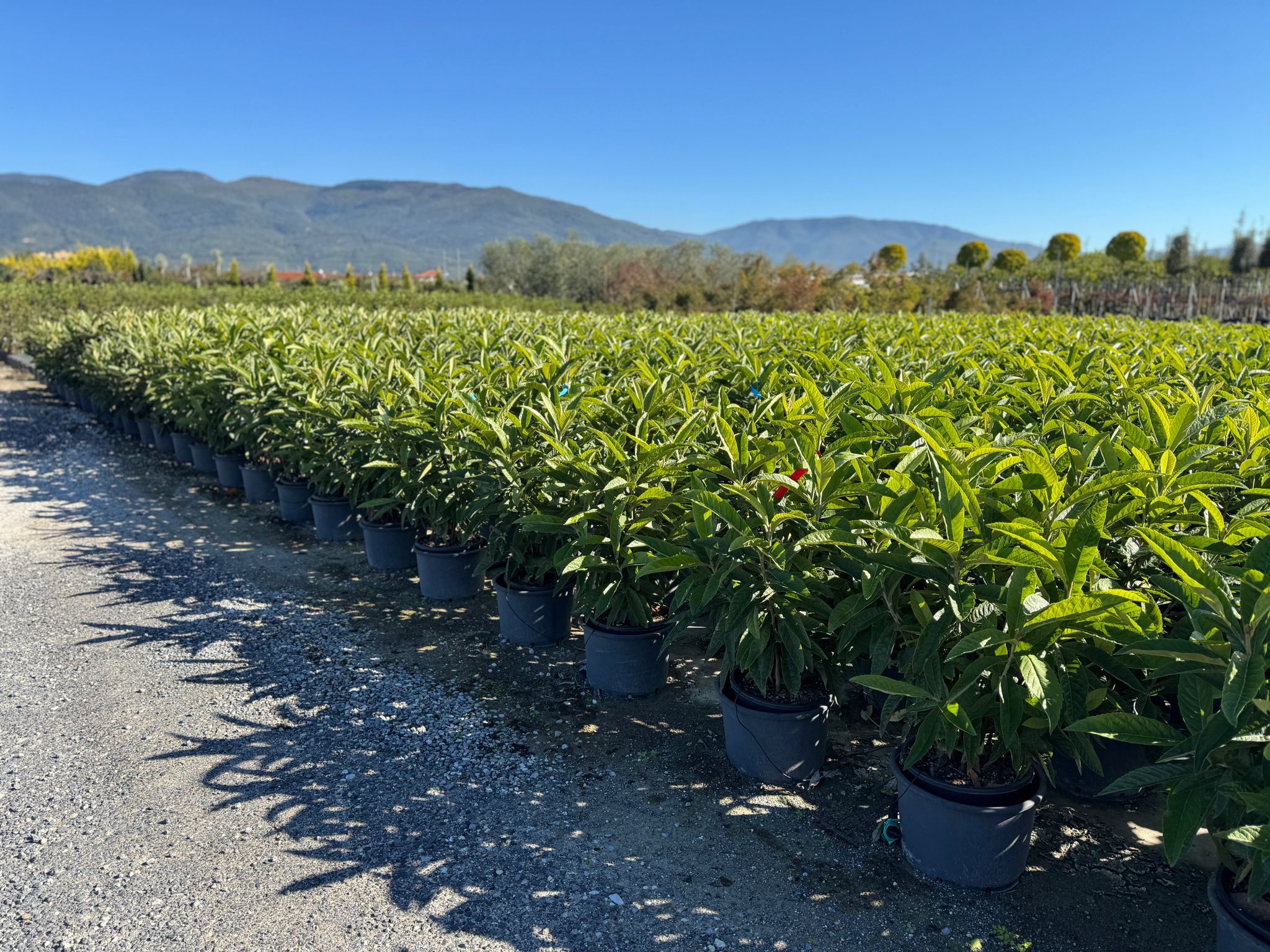 Met onder andere Nerium, Trachycarpus en olijven in diverse potmaten