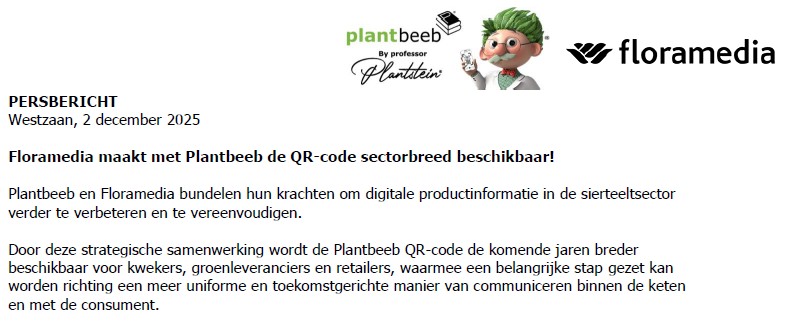 Door de koppeling van kennis en netwerken worden de kwaliteit, zichtbaarheid en het bereik van Plantbeeb aanzienlijk vergroot. Vanaf 2026 introduceert Floramedia Plantbeeb bij haar klanten. Zij kunnen de Plantbeeb QR-code direct laten opnemen in het ontwerp en de productie van plantenetiketten, potcovers, verpakkingen of stickers.